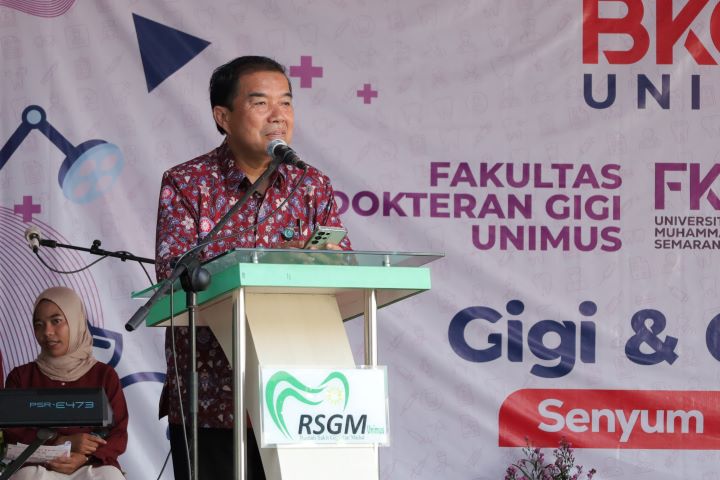 Semarang – Sebagai bentuk komitmen dalam meningkatkan kesadaran masyarakat terhadap pentingnya kesehatan gigi dan mulut, Fakultas Kedokteran Gigi (FKG) bersama Rumah Sakit Gigi dan Mulut (RSGM) Universitas Muhammadiyah Semarang (UNIMUS) kembali menyelenggarakan Bulan Kesehatan Gigi Nasional (BKGN) 2025. Kegiatan resmi dibuka pada Selasa (14/10/2025) di depan Gedung Dekanat FKG UNIMUS. Hadir dalam acara pembukaan Dekan FKG UNIMUS Dr. drg. Risyandi Anwar, Sp.KGA, Wakil Dekan I Dr. drg. Nur Khamilatussy S., M.M., Wakil Dekan II drg. Hayyu Failasufa, M.KM., Direktur RSGM UNIMUS drg. Budiono, M.Pd., Wakil Rektor II Dr. Hardiwinoto, M.Si, serta Wakil Rektor IV UNIMUS M. Yusuf, S.STPi., M.Si., Ph.D, Deputy Account Manager Unilever Semarang Benny Rinaldi Aliando Lubis, Sekretaris Umum PDGI Kota Semarang drg. Oktina Sakti Nurani, Wakil Bendahara MPKU PWM Jawa Tengah Dr. Hj. Mardliyah, SKM., M.Kes., Perwakilan Puskesmas Kedungmundu drg. Erisa Rinintia Pratiwi bersama seluruh panitia pelaksana BKGN 2025 dan tentunya Rektor UNIMUS Prof. Dr. Masrukhi, M.Pd.