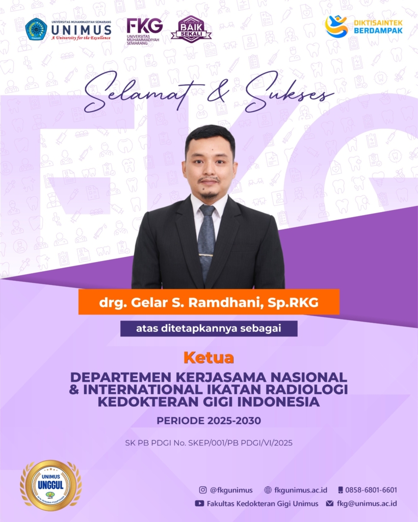 Fakultas Kedokteran Gigi Universitas Muhammadiyah Semarang (FKG UNIMUS) kembali menorehkan kebanggaan dengan terpilihnya drg. Gelar S. Ramadhani, Sp.RKG sebagai Ketua Departemen Kerjasama Nasional dan Internasional Ikatan Radiologi Kedokteran Gigi Indonesia (IRKG Indonesia).